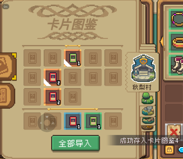 游戏中的卡牌有很大的作用,首先就是在野外进行刷怪的时候,一些怪物会随机掉落一些卡牌,可以在获得卡牌后,在秋梨村家园里进行导入,每一张地图中所掉落的卡牌都不一样,而一些等级比较高的卡牌,在图鉴中都写出来了技能!