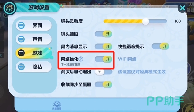 第二个设置点击“游戏”这一栏目,然后从中找到“网络优化”,虽然现在大多数情况下wifi网络都是比较稳定的,但也不排除有时它会波动,所以开启这一设置的话,它就会在你出现波动的时候自动切换到数据网络,这个时候你就不用担心因为突然卡一下而导致自己建立的领先优势被其他玩家超越了。