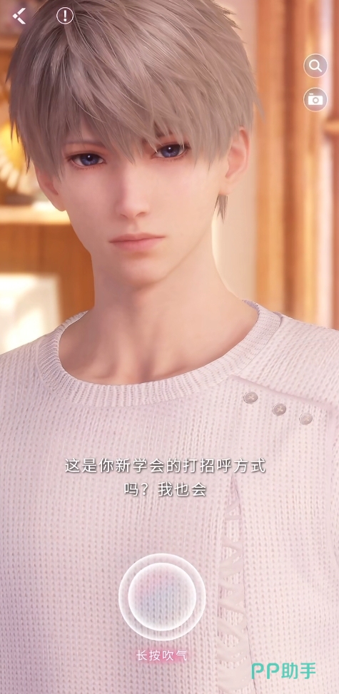 在动作方面,玩家也可以与沈星回进行独特的交互,首先是一个与多位男主都通用的交互动作,在与他面对面的时候长按屏幕即可对他进行吹气,沈星回会针对这个行为发出吐槽,有时他也会同样用吹气的方式来回应你。