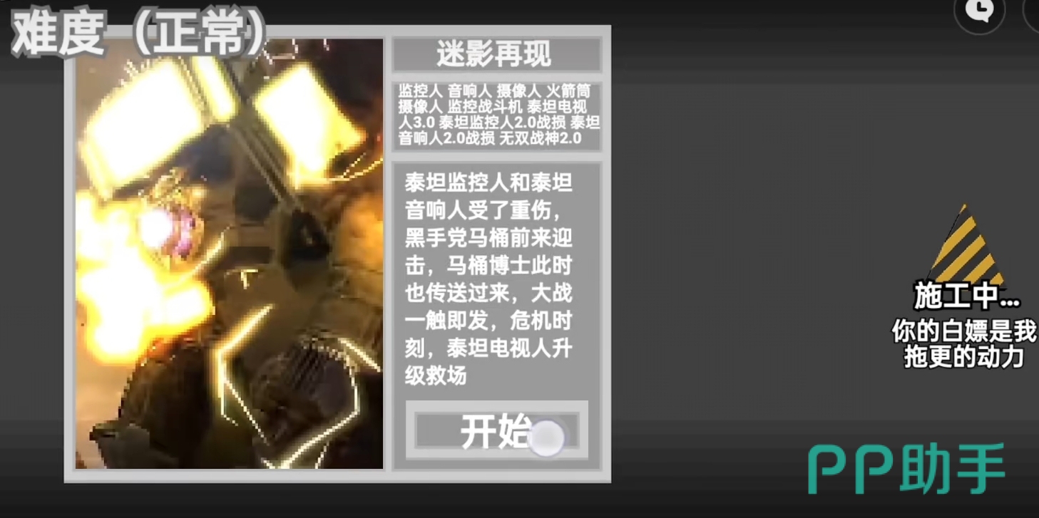 游戏的最后一关,也就是第16关迷影在线。随着我们的泰坦监控人和泰坦音响人都受到了重伤,敌人准备对我们发起最后的反攻大战,一触即发。可以说最后一关敌人的配置是相当的豪华,不仅有着马桶博士,还有着黑手党马桶,如果不注意的话,很容易会被其碾压,导致游戏失败。