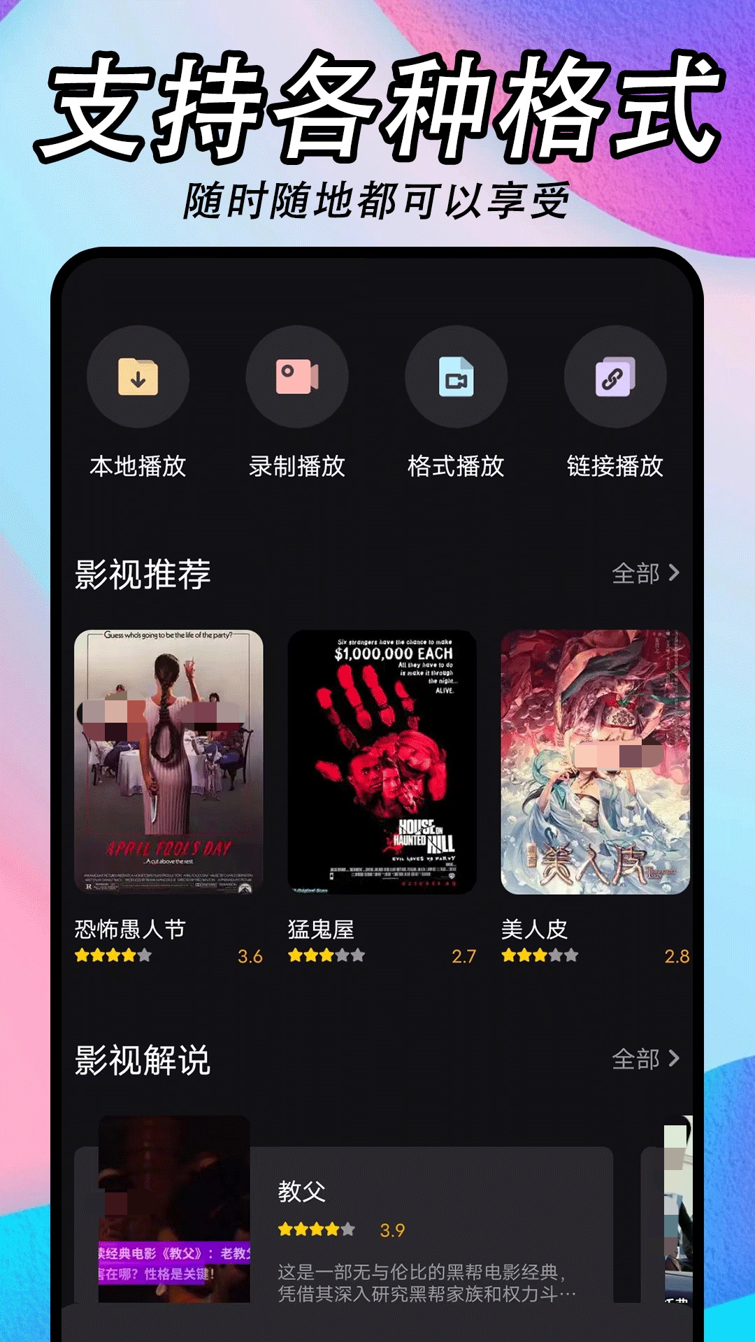 在这款软件中够用户们能够获取一些比较专业的影视推荐,这样能够让我们在这些推荐中找到自己喜欢的作品,同时这款软件对于视频的格式要求不是很严格,各种格式都可以打开,所以只要是我们已经在手机上下载好的内容,只要是下载的没有问题,都是可以快速地打开本地的内容的。