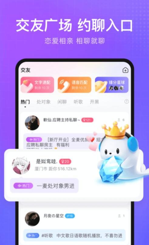 平台为用户打造了一个十分私密的交流空间,你可以与感兴趣的异性朋友,单独进行交谈,深入地了解对方,还可以约对方线下约会。软件中还有很多有趣的语音房间,其中包含了不少新颖的玩法,你可以进行K歌,展露自己的演唱技巧,在朋友面前一展歌喉,还能收到其他人的欢呼和鼓励。