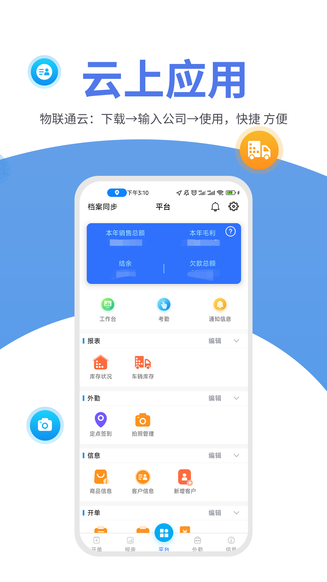 手机就可以完成对库存的管理,对销售数据以及库存数据进行全面的分析和了解,一键分享销售单,产品的信息有图有字更全面,外勤办公可以使用APP打卡。