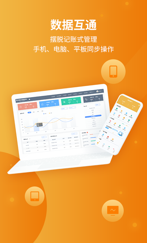 线上智能进销存管理APP,适用于多种行业和领域,批发和零售等都可以用,手机和电脑都可同步登录记录,数据同步更新,从采购到财务等各个环节都在管控范围内。