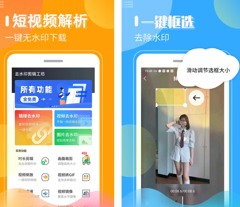 视频印痕精准消除,可一键框选范围消除logo、字样、网站链接等水印,粘贴链接也可提取其他视频网站的无水印视频。可对已有素材进行时长、屏幕尺寸多比例剪裁,一键导出或分享。