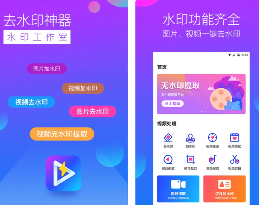 水印功能齐全而且操作也比较简单,5种去水印方式任选,还有特色的证件加水印防止盗用的功能,可以添加萌趣生动GIF贴纸遮挡水印,帮你将视频变得更美观。