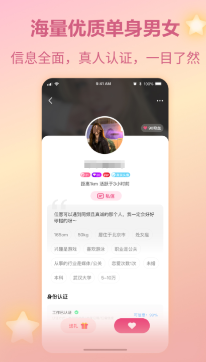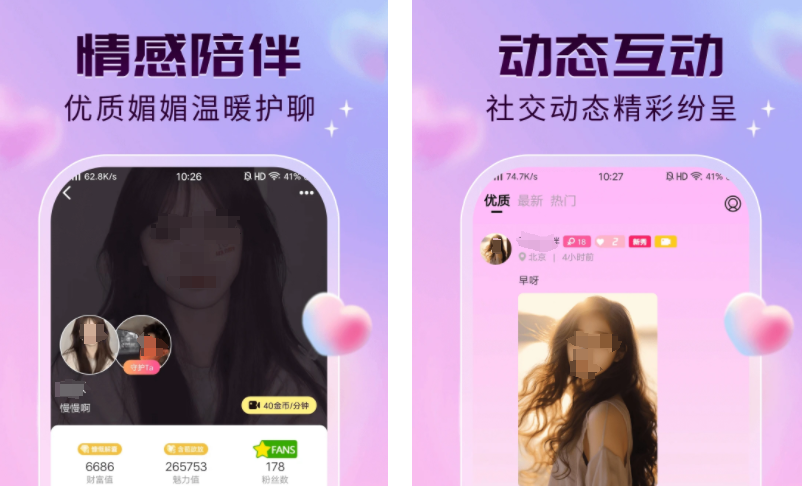 这款是主打异性交友与相亲的聊天软件,有匿名聊天处cp玩法,帮你快速与陌生人破冰聊天,双方有好感再互相关注认识,帮你打发寂寞无聊时刻,感受耳目一新的交友。