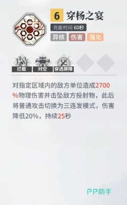 穿杨之宴:它同样是一个异核技能,其主要作用是伤害和强化,其出处是四星物理角色狄砚,它的效果表现为对区域内的单体敌人造成2700%物理伤害,并且可以击落敌人的投射物,所以是一个兼具输出和防守的强力技能,同时使用后角色的普攻还会再后续的25秒内获得强化。
