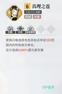 真理之霆:该技能是主动伤害技能,不过本身有着足足90秒的冷却,这主要因为它属于异核技能,这类技能往往相当于角色的大招,而它的出处则是四星雷系角色刘兄,作为他的终极技能,其总伤害加成倍率高达4200%,并且技能的效果是连续攻击目标半径350范围的所有敌人,这个连续攻击也可以理解为连击,虽然该技能的总伤害非常恐怖,但因为有这一字眼,所以它并不会一次性打出。
