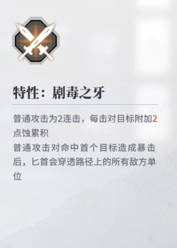 剧毒之牙:这是一个特性技能,它的出处是五星蚀元素角色吉娜,这是一个爆发型输出角色,本身有着不俗的攻击力,但对比一流角色还是差了一些,不过这个特性技能提供的被动效果可以让她的普攻变成两连击,同时每次攻击还会附带额外的2点蚀累积,另外其普攻本身还能必定对首个目标造成暴击,同时也可以穿透路径上的所有敌人,后面的这几个追加效果都正好可以通过连击来多次触发,连击的强力之处在这里体现的淋漓尽致。