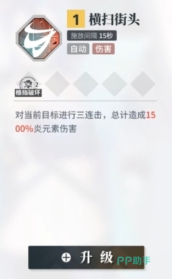 横扫街头:它是自动化的一个主动技能,其出处是四星角色霍冉,这一角色作为炎系输出角色,有着恐怖的爆发能力,不过因为品质不高的原因所以攻击数值较低,而有了这个自动伤害技之后,她就可以对目标进行三连击,以此造成高达1500%的炎元素伤害,这个技能的加成倍率是非常高的,而且因为是连击的缘故,所以敌人并不会特别好躲开。