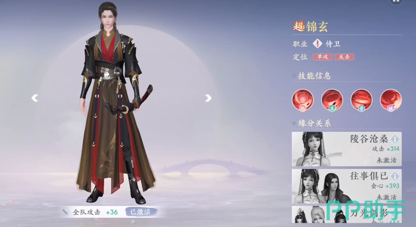 锦玄:这是十分英武神气的一个强力男角色,作为侍卫的他更擅长于进行近身的单体攻击和反击,技能方面,怒攻可以朝着敌人突进并对最多三名敌人造成伤害,伤害他们的同时锦玄自身还会获得攻击力提升的buff,这个buff持续的时间很长,基本上全场下来都可以一直生效。