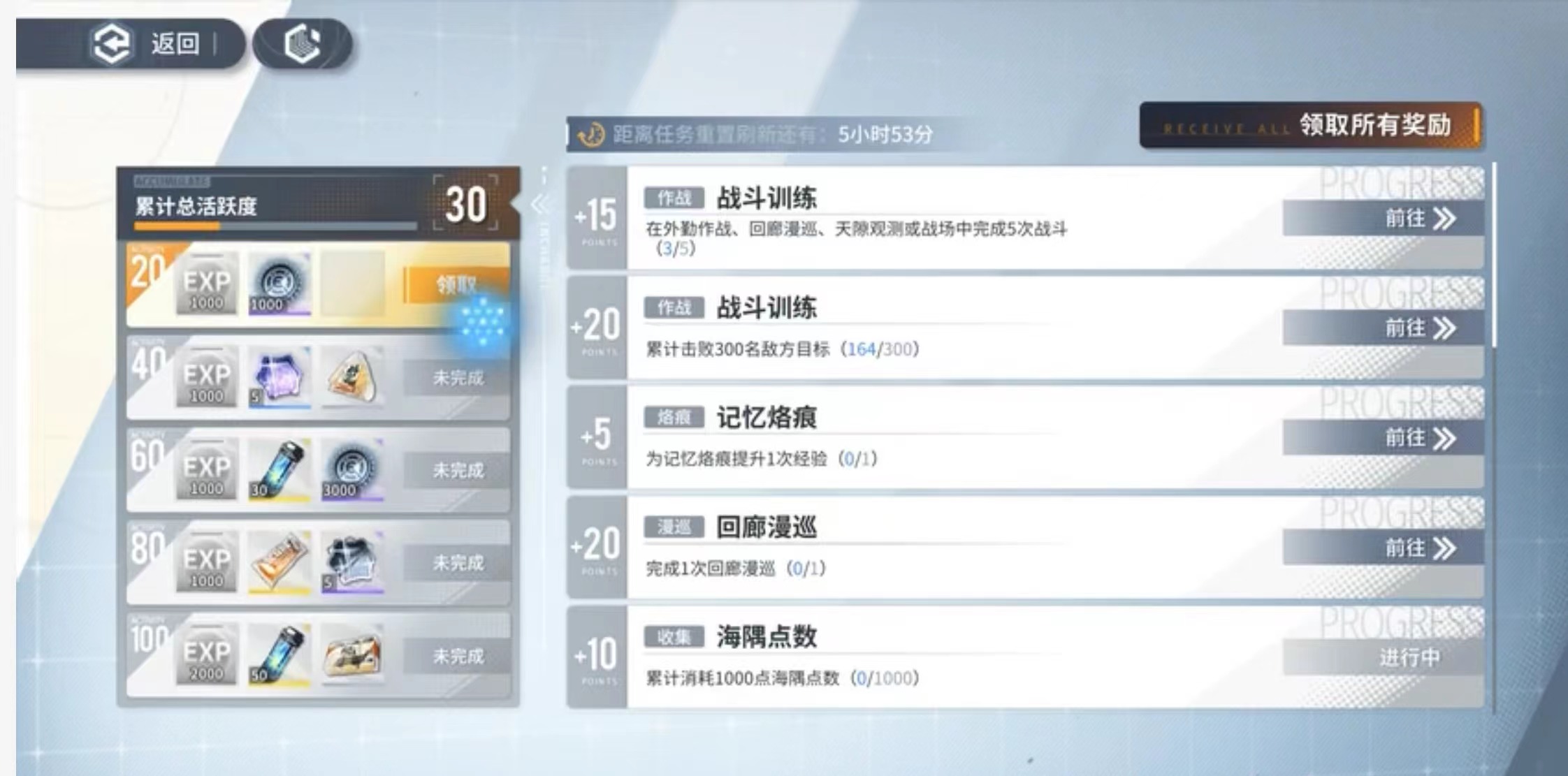 首先第一点,玩家进入游戏选择你的任务,点击查看你的总活跃度,查看战斗训练,如果战斗训练的数值过小,那么你需要开始战斗训练才可以进行记忆烙痕,它可以提升你的经验,也可以让你在故事剧情中更快速的提升等级。