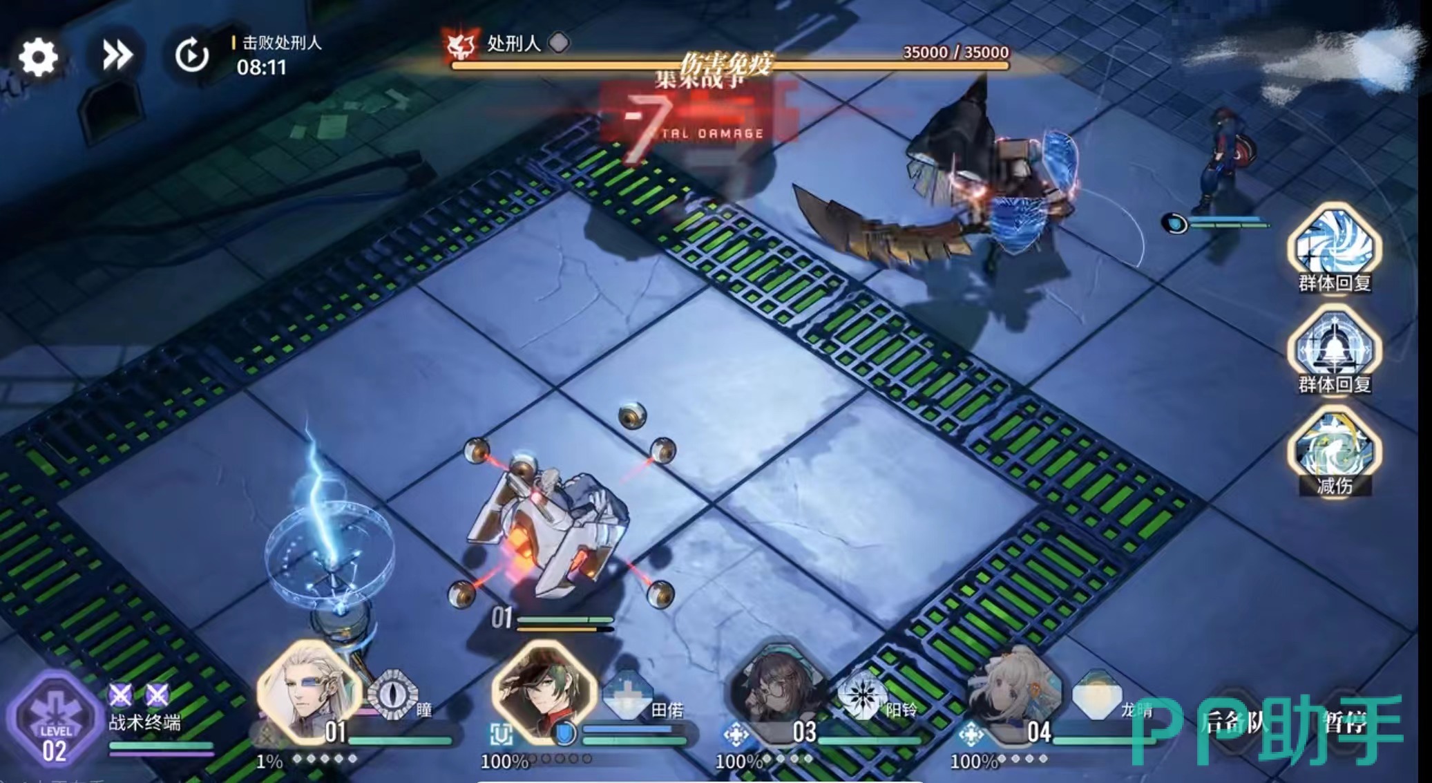 第二个技能主要是强化自己本身和恢复生命值,使用当角色使用这个技能后就会开启防护模式,在防护以内会恢复生命值的3%,最高可以持续20秒。如果在防护值内有队友,那么会对队友也进行一个生命值的恢复。如果在防线以内有敌人的话,会对敌人造成眩晕效果,会让敌人立刻进入石化状态。