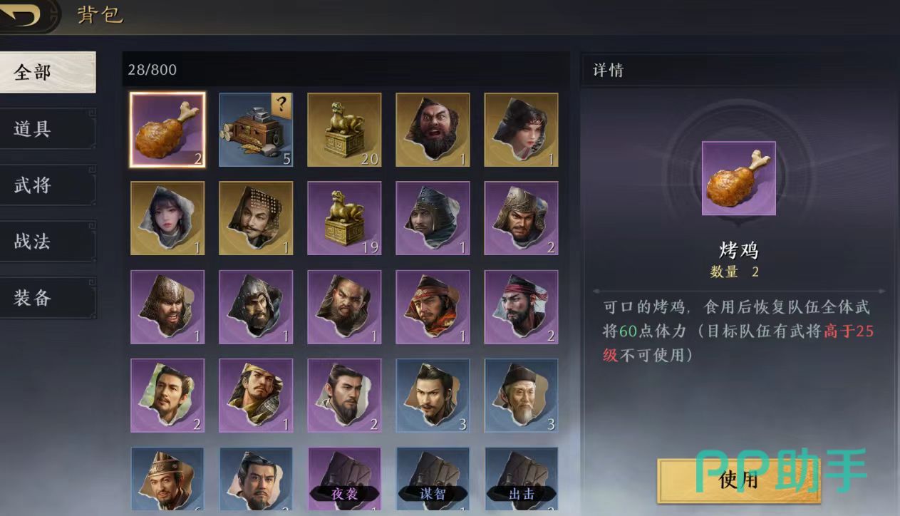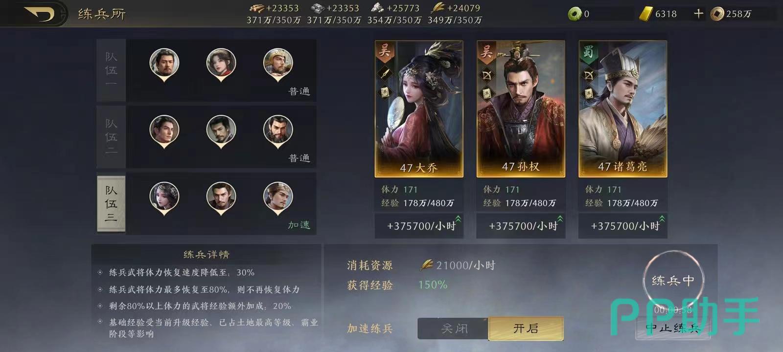 开启战斗需要消耗体力,武将体力如果不够,需要消耗道具补充,例如任务赠送的烤鸡,青囊职业炼制的丹药等。充足体力能够帮助武将快速升级。战法是武将展现自身战力的重要途径,主要分为升级和学习两大类。每个武将都有自己的自带战法,也可以学习新战法,这样形成搭配。而战法搭配是很重要的策略,要根据武将自身特点以及其他队友特点进行打造,根据自身所需要打造成的流派进行收集。如果学习战法和队友不能很好搭配起来,就不能达到目的,这样即使投入巨资也没有理想中的效果。适当增加一些辅助战法,有时比一味强调伤害要更有效。