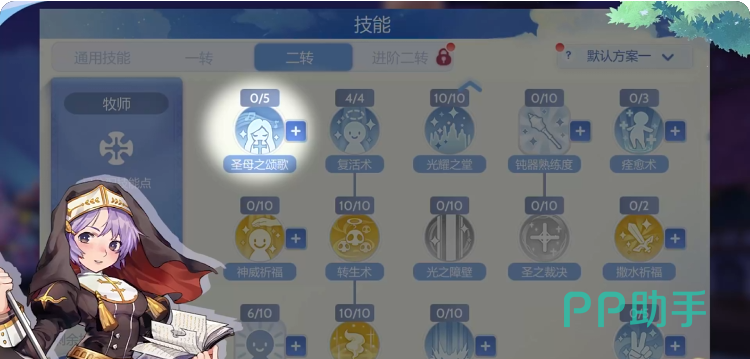 在进行二转后,圣母之祈福是必须加点的,可以将双防提升,同时还可以将治疗量的冥想给提升。次要的技能可以选择沉默之术,PVP十分好用,还有天使之怒,可以将高伤害得到额外的加成,另外就是圣神殿堂,这个技能可以在短时间里面将伤害给免疫。神圣殿堂可以当下会必死的高伤害技能,一点就可以了,因为点高了会延长咏唱的时间的,蓝水可以选择,因为可以回复魔力。