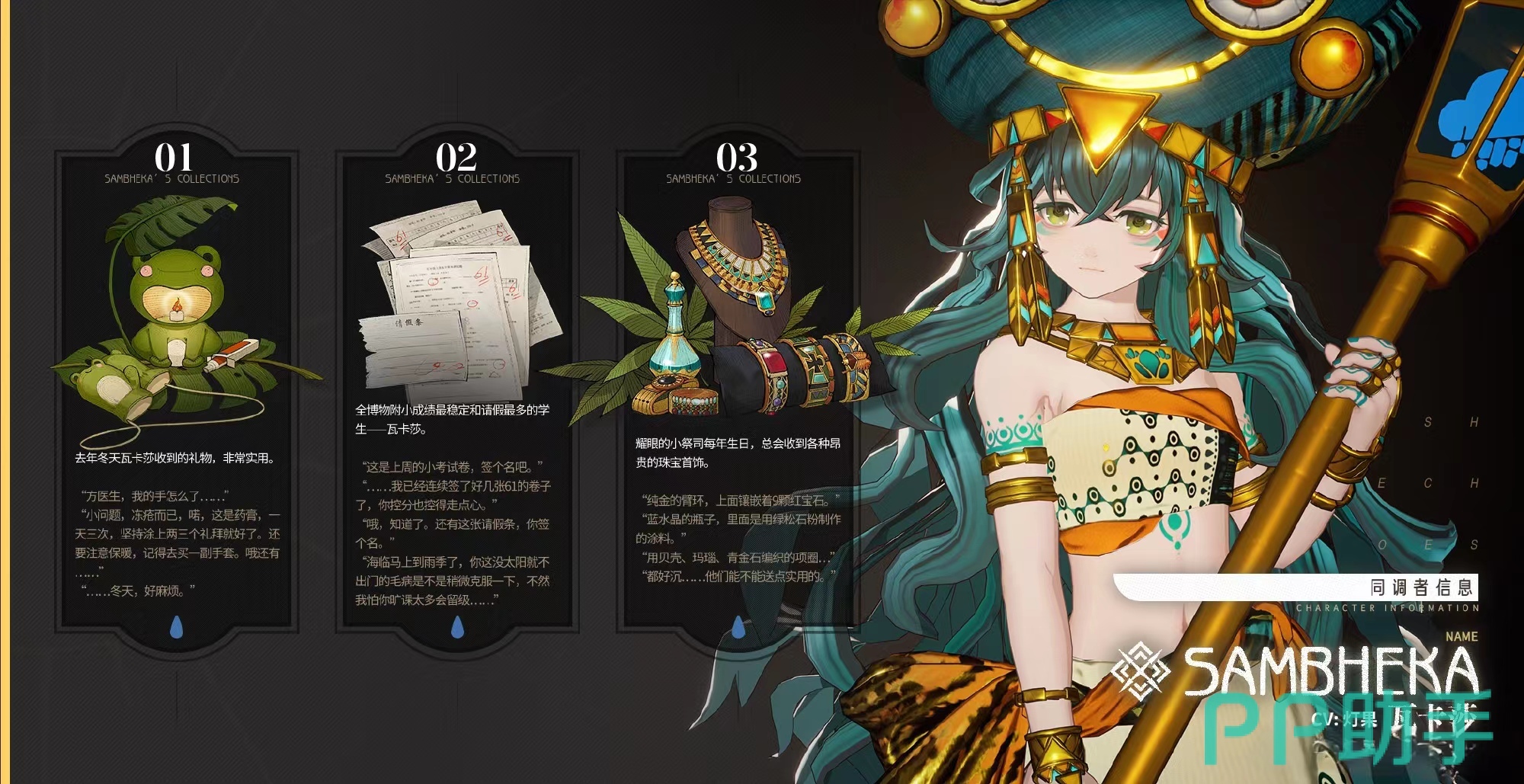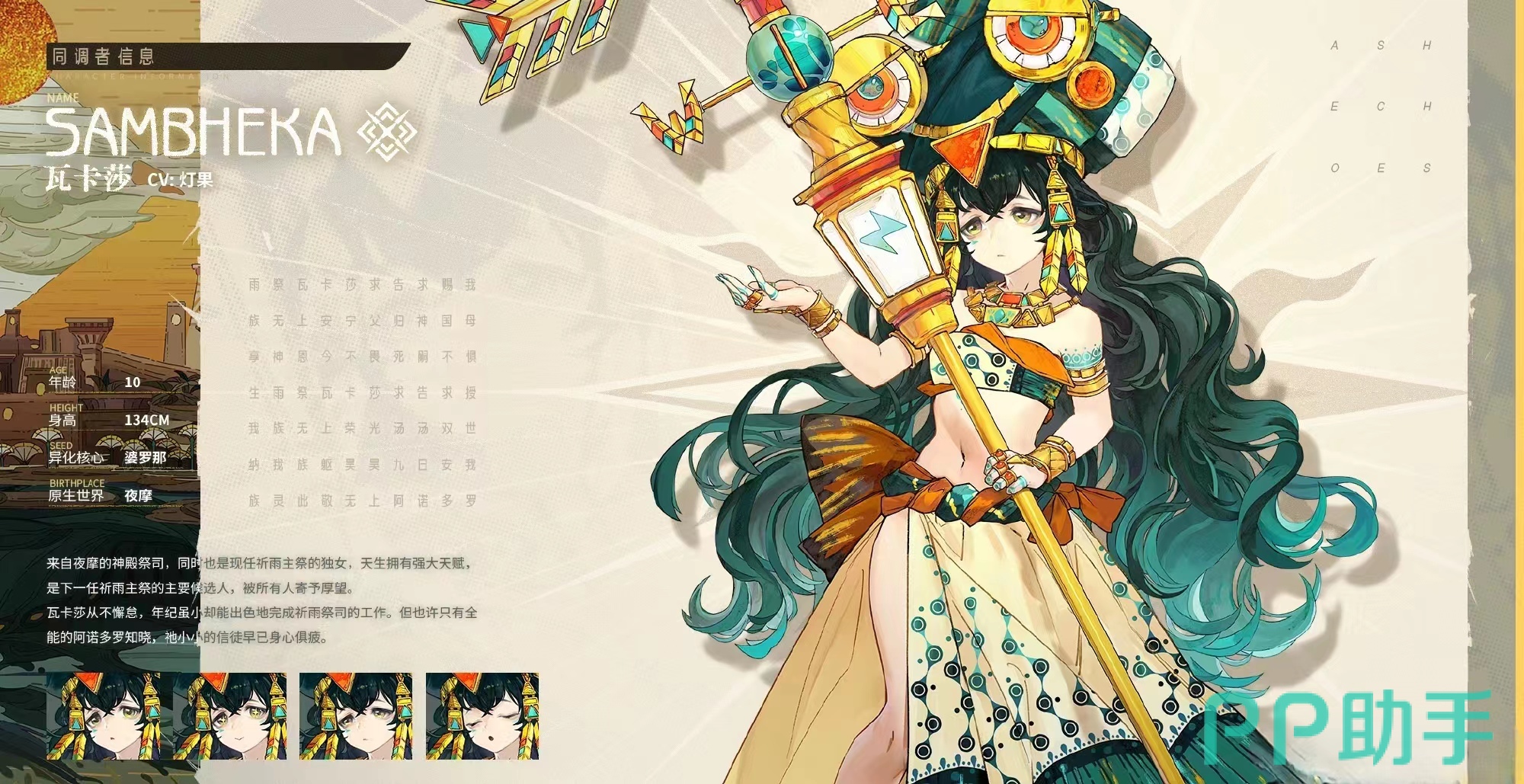 瓦卡莎在游戏当中是一个画风非常精致并且充满着异域风格的美少女,一头墨绿色的长发再加上深情的双眸,是她的外貌特征之一,同时她目前在游戏当中也是一个T0级别的强悍型角色,她的背景故事介绍是来源于一个雨季司的独生女,天生就拥有着非常强大的天赋力量被所有人寄予厚望,也因此能力上面是强悍的。