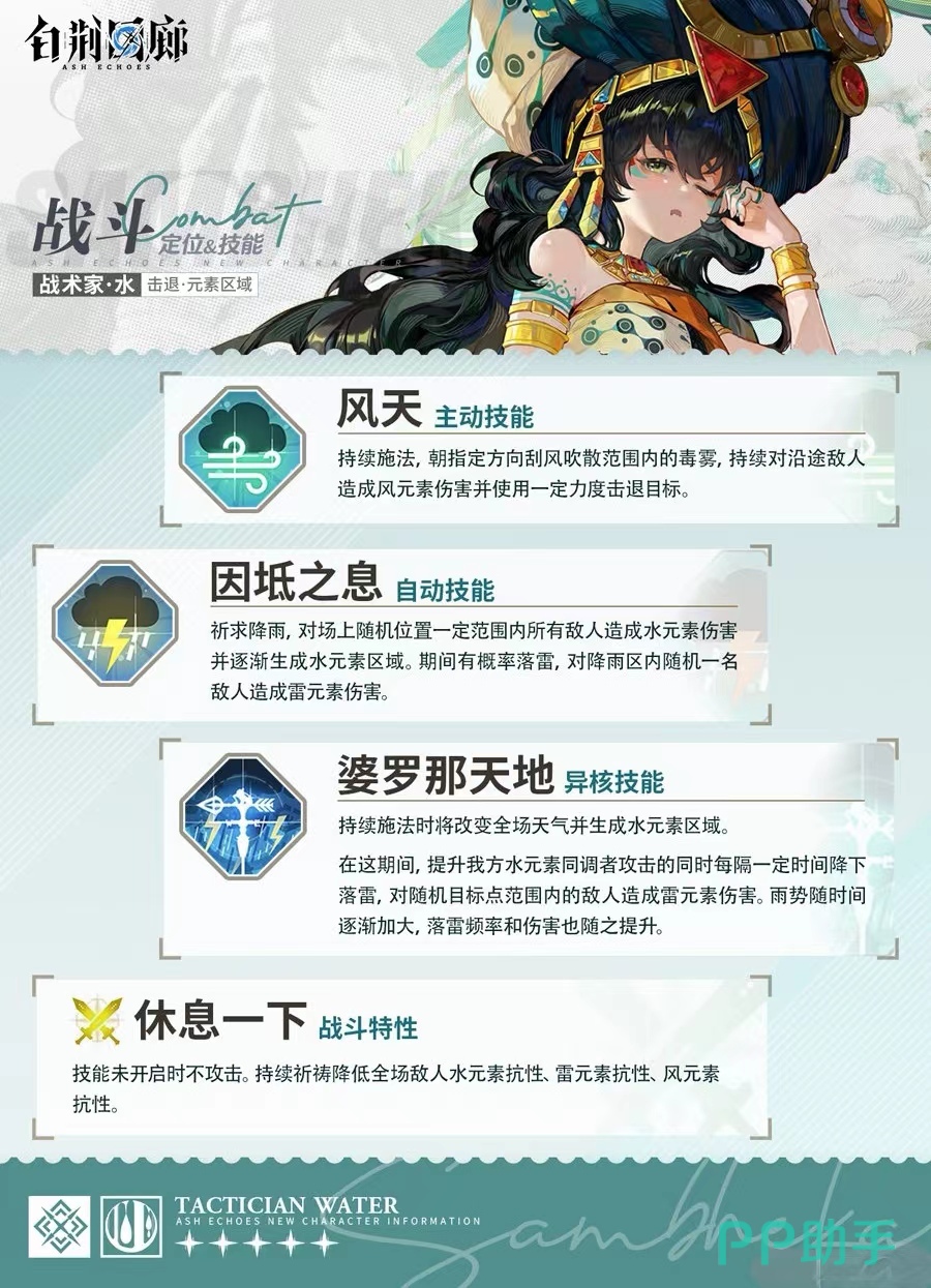 她在团队当中主打作用就是求雨协助,从控制面板上来说比较薄弱,在她的技能打开时会进行祷告能让对方水属性的对手自身抗性减少20%,雷属性的抗性减少10%,风属性的抗性减少10%,同时等到自己的等级升满之后封神的时间还会进行增长,强度来说是十分大的,一技能可以向指定位置刮大风,同时对敌方造成风属性的元素伤害,二技能是求雨在范围之内可以让对手遭受到两秒的水属性伤害并且还会伴随雷电,可以说她是一个比较全能型的选手能降低敌方属性也能进行一定的攻击作战。