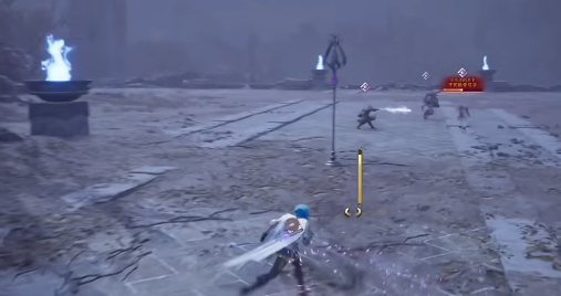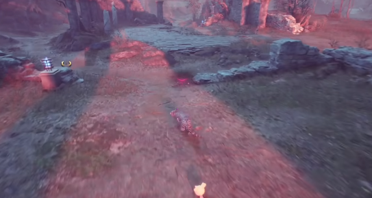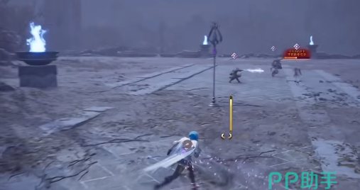 最后一部分需要玩家穿过一片水域,这里的水角色只要碰到就会死亡,不过半空中有一些破裂的建筑物可以借力,踩上去就可以依靠跳跃穿过它们,然后来到大堂中间。这里会看到有一个法杖一样的道具立在地上,旁边还有怪物。首先把没有红线的怪打掉,然后再逐一解决剩下的,这样难度就会降低不少,全部清理完之后采集柱子然后去打BOSS,需要把地上的小金块踩完才好打他,还要灵活的躲技能,耗上一段时间就可以清理掉它了。
