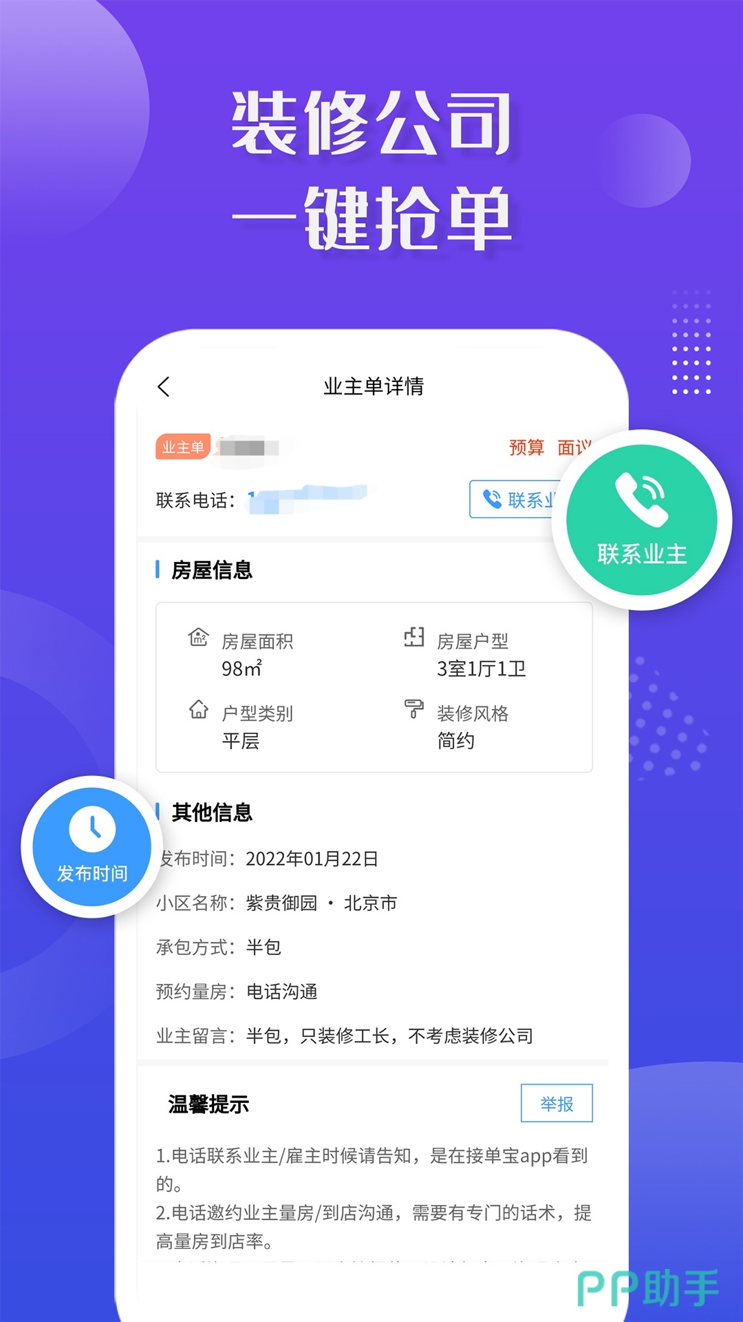 提供业主装修需求的订单,业主可以选择装修公司以及设计师等,之后设计师就可以与业主面对面沟通了,工价透明,一键接单满足业主寻找设计师的需求。