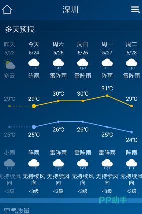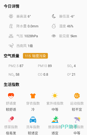 它对天气的预报不仅有温度,还能包含风向、气压、空气粉尘度和空气湿度,可以通过定位来直接获取当地天气,也能搜索其他城市查看天气情况。