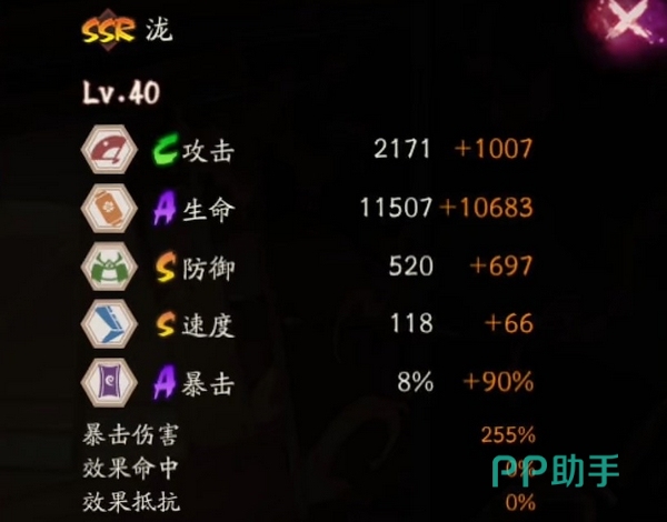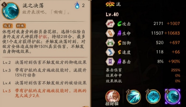 SSR的龙40级面板如上所示,是一个比较侧重防御和速度的式神,生命和暴击属性也不错。普攻“湍刃”,平平无奇的单攻,基础100%倍率,升到lv5能有125%的倍率。