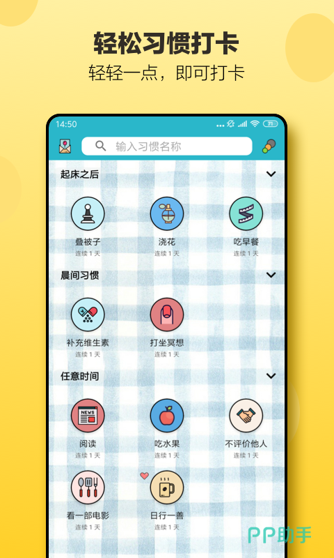 自律打卡这款软件可以让用户每天都设定一个打卡任务目标,而且大家能够非常清楚的查看哪些目标是已经实现,而哪些目标是等待完成的,所以会非常明确的查看不同的目标任务情况。并且在这个软件中,大家能够以日历试图的视角下来,完成每日打卡任务的绘制和编辑,这个视角会更加清楚和直观的展示每天的任务情况。同时在这款软件中,大家能够快速地设定不同的打卡任务界面,来实现不同任务的区分。