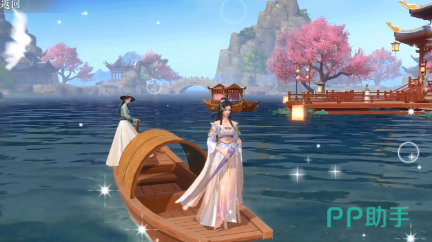 在正对的仙音阁的湖面上,玩家会遇到第一个宝箱。这时玩家要做的就是让船娘把船停住,然后拾起宝箱,这个宝箱里面就是仙音阁奇物泛舟湖上,完成这一系列的动作。玩家也就把浮生忆玲珑这个游戏中的坐船的任务彻底完成了。