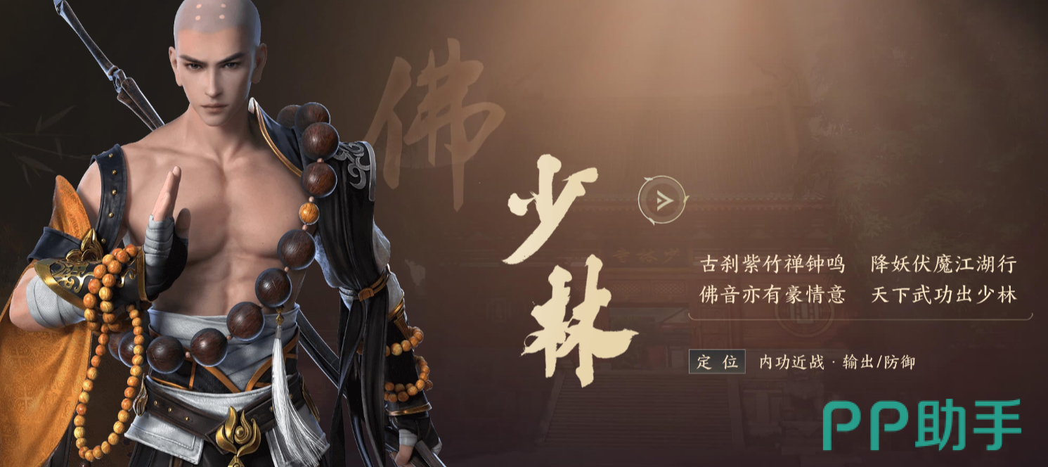 第二个职业是【少林】。少林也是拥有两个心法的门派,玩家可以选择成为近战输出或者是作为坦克站在队伍的前排。在游戏中只有男性角色才可以加入少林。少林是非常具有东方韵味的,玩家们能感受到少林的豪情和豪放。