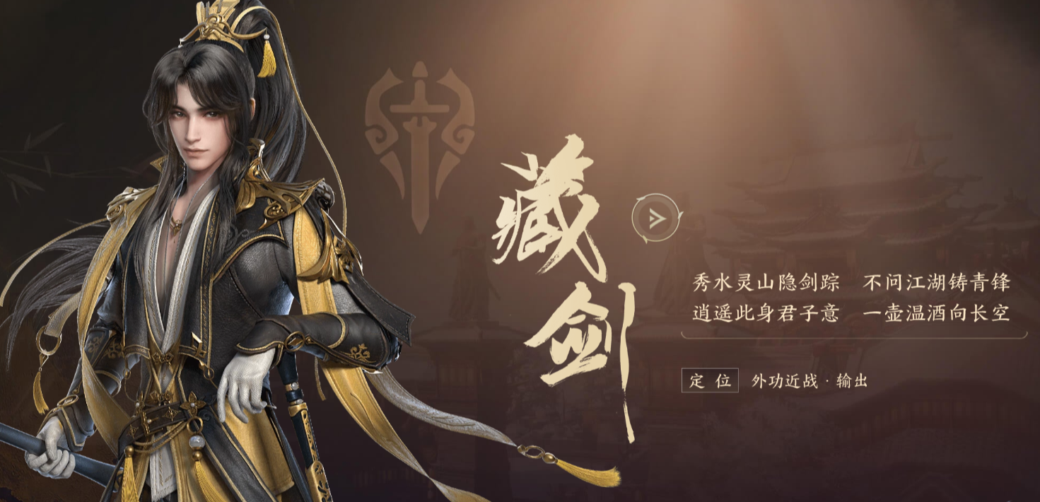 第六个职业为【藏剑】这一门派是非常帅气的,都是近战外功。藏剑也是有双心法的,不过不像前面五个门派,藏剑的两个心法是分别食用重剑和轻剑的。如果说纯阳是武侠故事中的剑客,那么纯阳就是西湖中的公子,优雅而凌厉。藏剑的代表颜色是金黄色,也代表了游戏中“叶家”的实力。