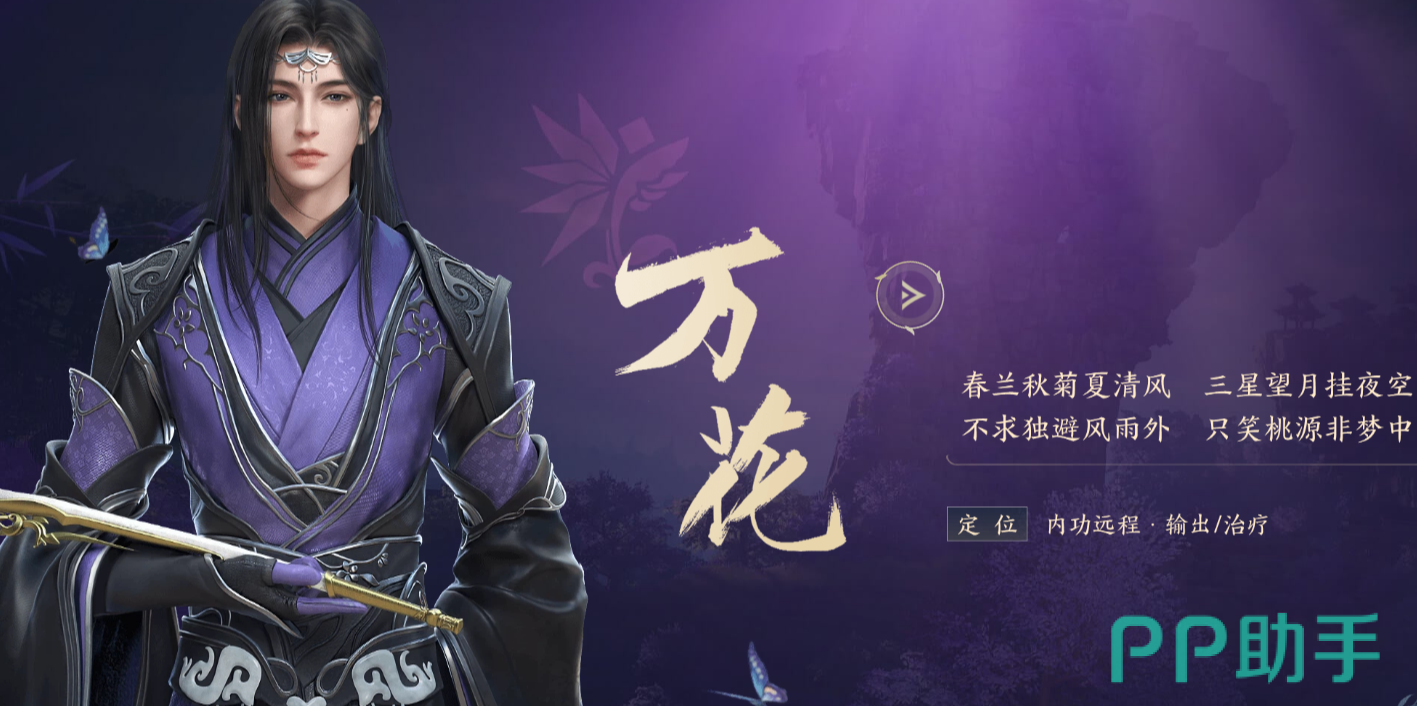 第四个门派叫做【万花】。玩家可以选择成为奶妈或者远程输出流派。万花在游戏中是典型的医者形象,医者仁心,孙思邈的故事令许多玩家动容。淡紫色是最好诠释万花的颜色。