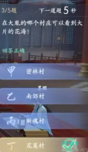 接下来就是游戏中的第三个题目,需要玩家选出可以看到花海的村庄,从游戏中给出的四个答案,玩家也可以轻松的判断出来,向前三个选项的断魂村,南郊村以及密林村都不像有花海的样子,但是第四个花木村是荷花有关,所以最有可能从这里看的花海。游戏中的另外两个题目是每一个玩家都能答对的,如果想要观赏汴京的场景,那肯定需要寻找马夫帮忙,最后一个题目为玩家来到福家班初次接受了哪种考验,参与过游戏的都可以选择出正确的舞蹈选项。