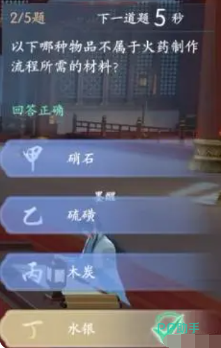 接下来就是第二个题目,这个题目就算没有参与过这个游戏,有很多玩家应该也是能够选出正确答案的,题目询问的是制作火药不需要的物品,这个可以使用排除法,首先,硝石和硫磺是必须的,然后玩家需要在木炭和水银中选出一个和火药制作无关的,在这两个选项中木炭是可以排除的所以这个题目可以选择水银。