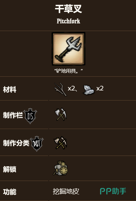 干草叉的制作方法很简单,只需要消耗 2*树枝和 2*燧石,就可以在科学机器下的工具栏中制作出来。装备干草叉之后,玩家可以在指针处看到一个方格,表示当前的地块。点击地块就可以挖掘出地皮放入背包中。
