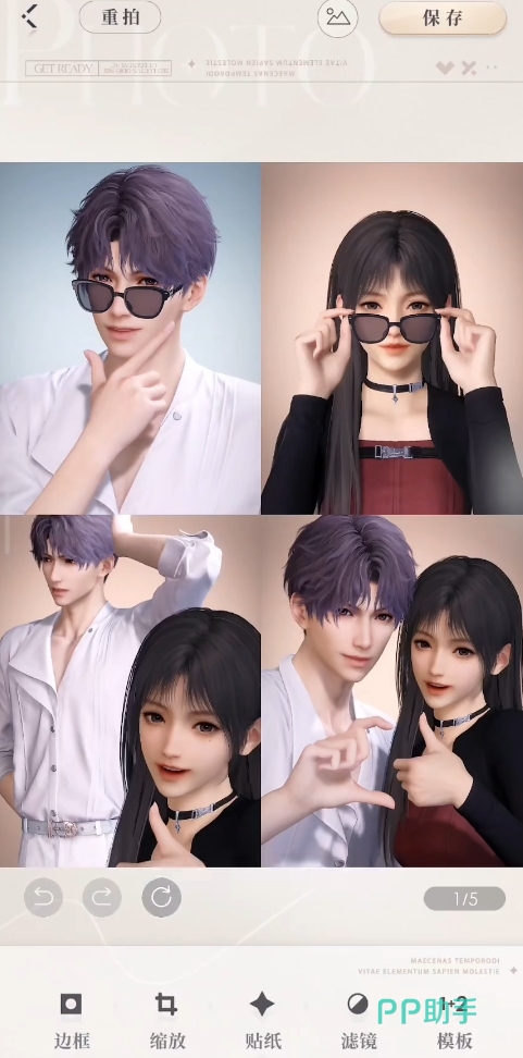 当然了,最重要的拍情侣大头贴也必不可少。各位可以给自己与他选择好衣服配饰,开始进行自己的摄影。有多种动作的选择组合,无论是两人亲密一起的比心,亦或者是自己的搞怪和他的困扰,都在这里表现的淋漓尽致。拍摄完之后还能自己进行边框以及样式的修改,包括额外的贴纸,滤镜等等,拍完之后就可以保存手机了,这方面做的相当不错,期待未来可以做出更加高质量的动作互动。