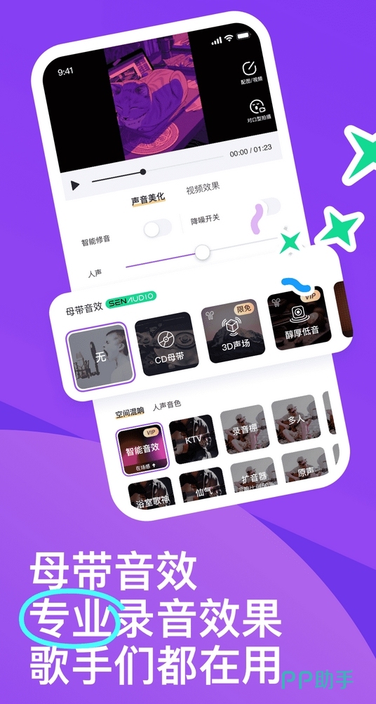 这款软件高端大气上档次,特别适合音乐从业者、唱歌爱好者和发烧友们。它打造了一个独特的社区,让你通过歌声结识志同道合的朋友,随时在线交流心得。它提供了各种歌曲和音效,让你随时随地都能用自己的歌声释放情绪,记录生活的点点滴滴。而且它还有一个独特的K歌社区,24小时都有歌友在线PK、交流,让你尽享唱歌的乐趣。