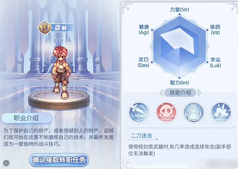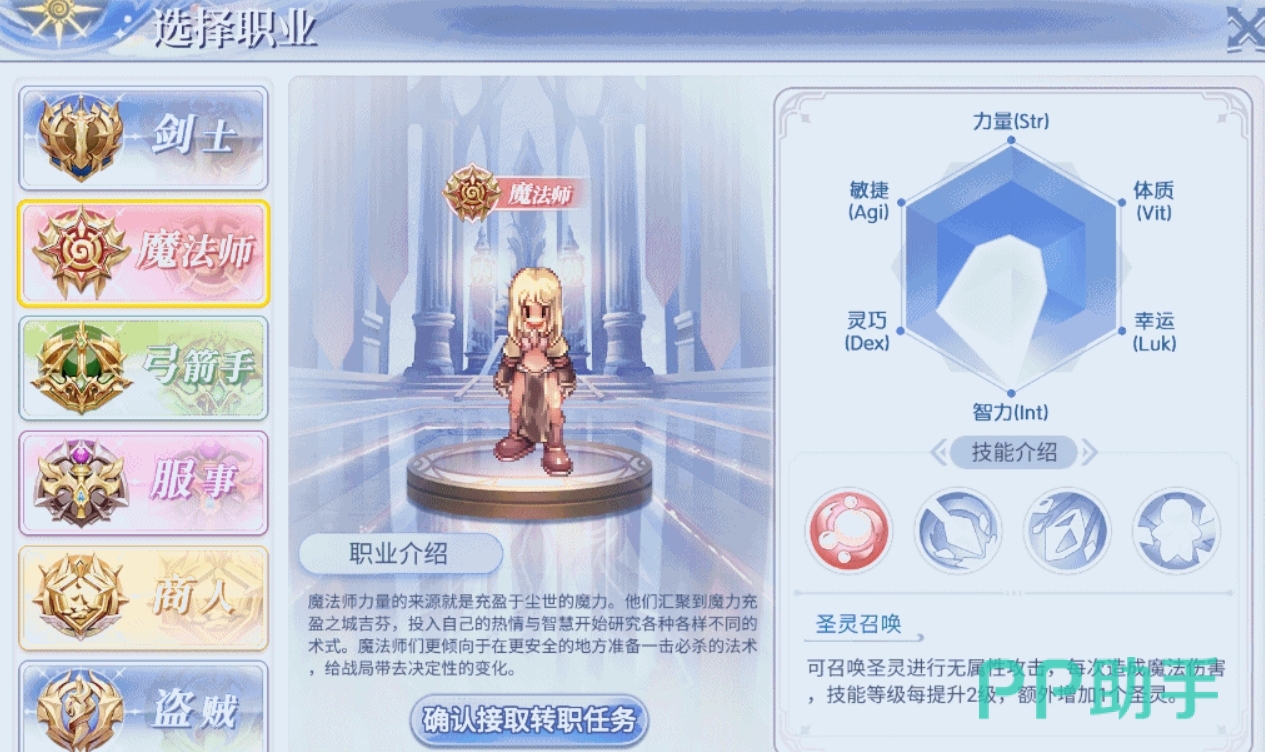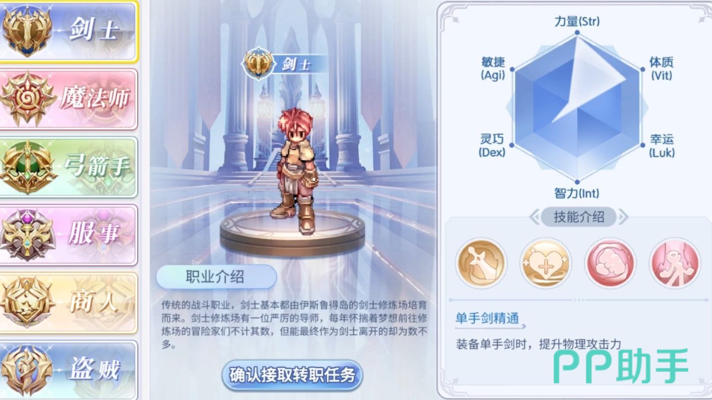 在各个职业的介绍中,可以看到每个职业对应的各项属性。属性分为了力量、体质、敏捷、幸运、智力、灵巧。每项属性都代表了不同方面的基础属性。