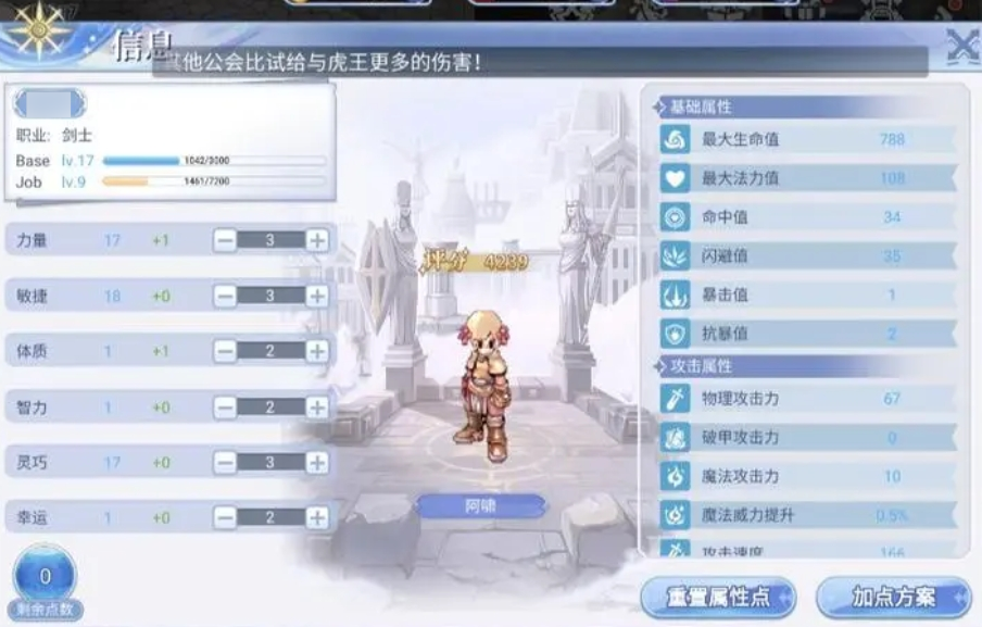 智力对于服师、法师来说很重要,可以用来提升魔法攻击力;灵巧能够帮助猎人和弓箭手提高命中率和吟唱的速度。幸运属性则是用来提升暴击值、抗暴值和回避率,每个职业都需要这项属性。