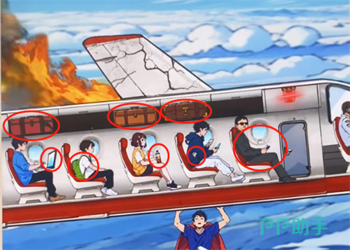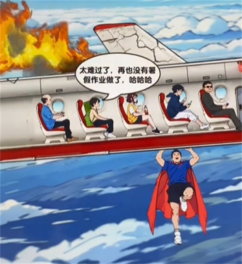 为了拯救所有人,我们必须减轻飞机的重量,我们要把所有的行李箱从行李架上扔下去。然后,我们要找到穿蓝色卫衣的男生,他的口袋里有一种可以让超人恢复力量的药物。我们要把这种药物给超人吃,让他帮助我们。