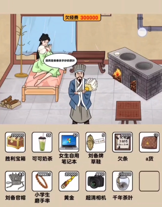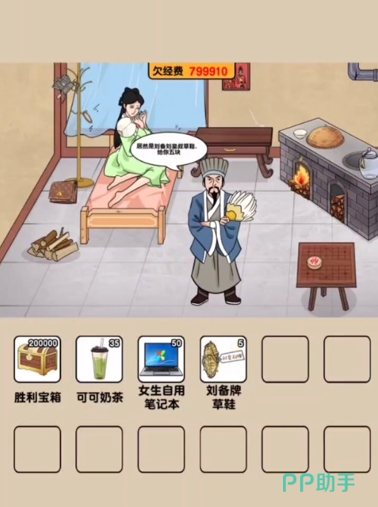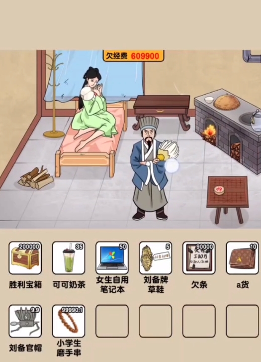 我们再将草鞋拖到刘备大营上面,就可以得到刘备牌草鞋,结果诸葛丞相居然认为这只值5,这要是让刘皇叔知道了,那还不气死了。我们再把孙尚香与刘备的结婚照移开,就可以得到一个价值90000的欠条,想不到有人居然欠了刘皇叔这么多钱,也不知道欠钱的那个个人还不还的上。接着我们把手串给丞相就可抵消99990.1,再将A货包包和刘备的管帽给丞相就可以抵9.9和10。