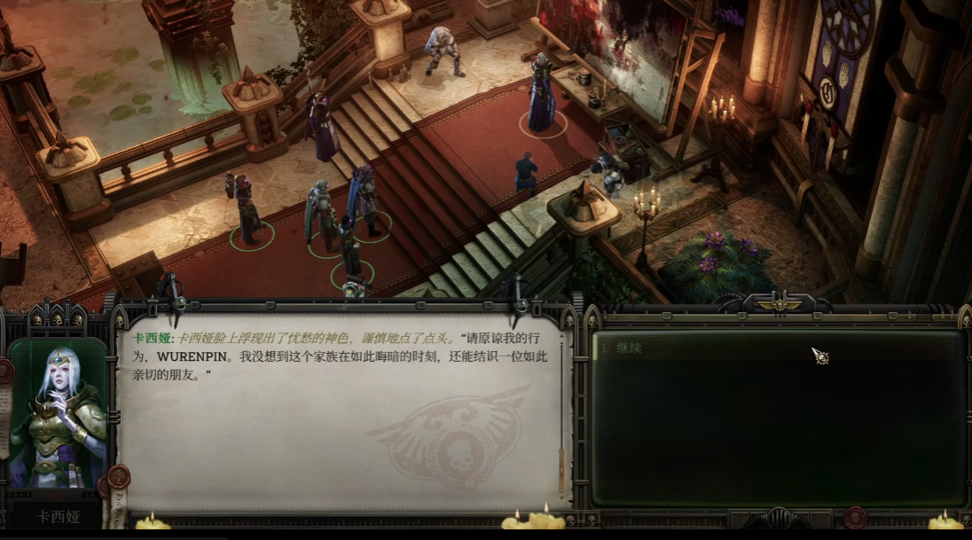 卡西娅:初遇的时候会观看一场在大厅里面的剧情,有很多对话,基本上只要点继续就可以了,在跳出来选项的时候可以看左侧她的话主要偏向于什么,跟着选就不会有太大的差异。基本好感度积累之后,她就会对玩家有一些情愫,说的话也比较温和,继续正常沟通就会进入互相送礼物的环节。