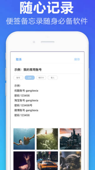 该软件最大的优点就是简单好用,而且占用的内存空间比较小,无论您是记录生活中有趣的事情,还是写笔记或者是备忘录以及消费清单均可满足,可通过多彩颜色来分类,如果不想让自己记录的内容被他人发现,也可加密,支持语音输入,在记录过程中可插入自己喜欢的照片。
