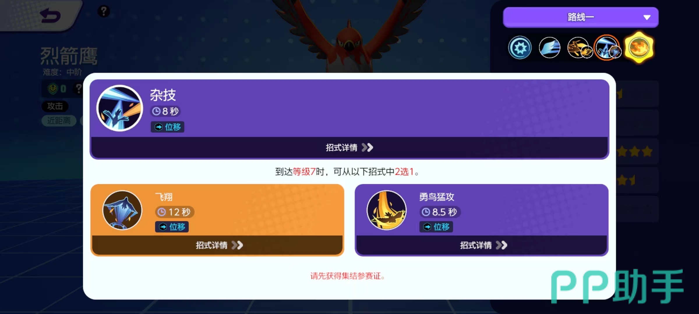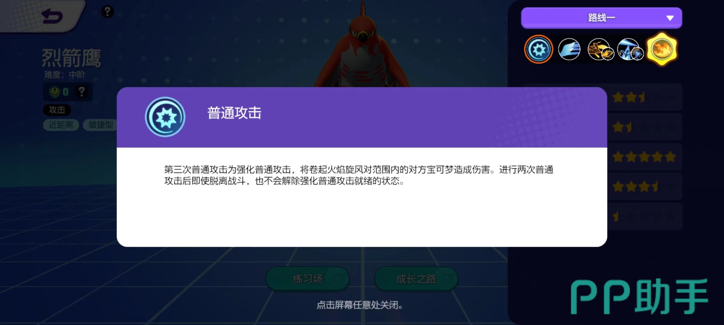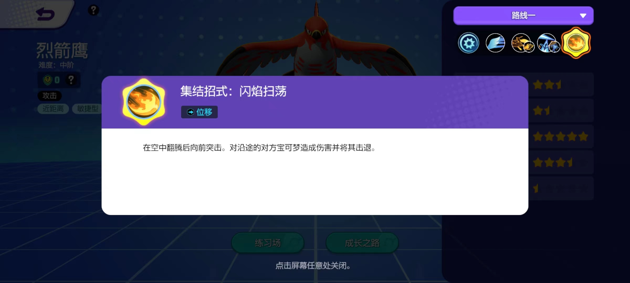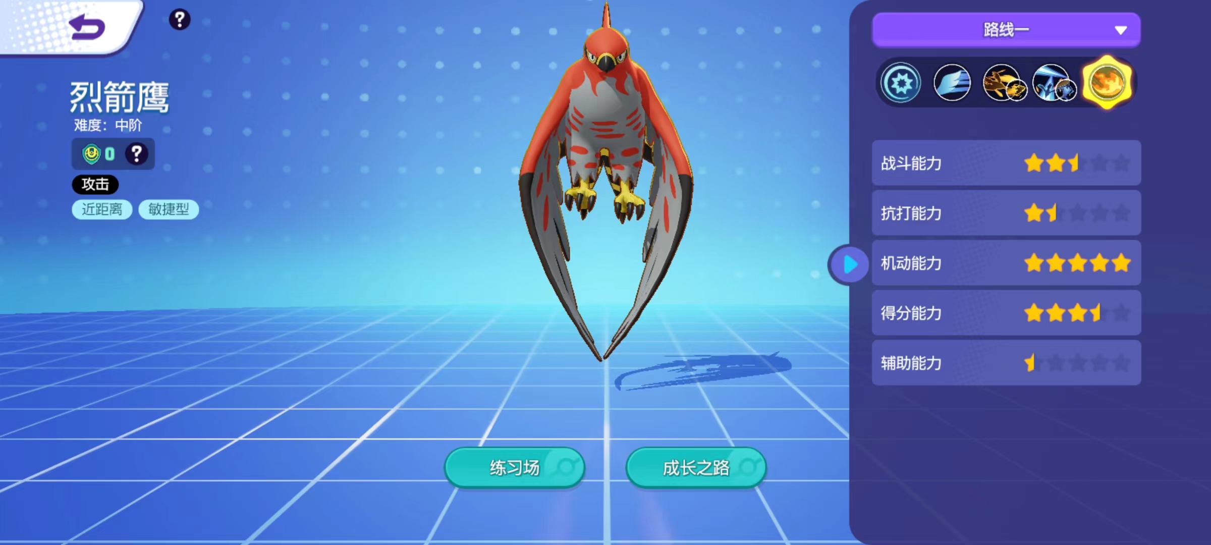 烈箭鹰在游戏中最大特点就是机动能力已经达到了满星,这是其他绝大多数宝可梦都难以实现的优势,虽然换来较低抗打能力和辅助能力,但利用好机动性方面优势,依然可以给对方造成很大的麻烦。强化后的普通攻击利用火焰旋风造成范围伤害,特点是进行两次普攻后,即使脱离战斗也不会解除强化后就绪状态,这样能够有更大的操作空间。被动效果疾风之翼,在自身体力较高时,移动速度大幅提升,这样在绝大多数战斗时间内都能保持高移速快速穿梭。