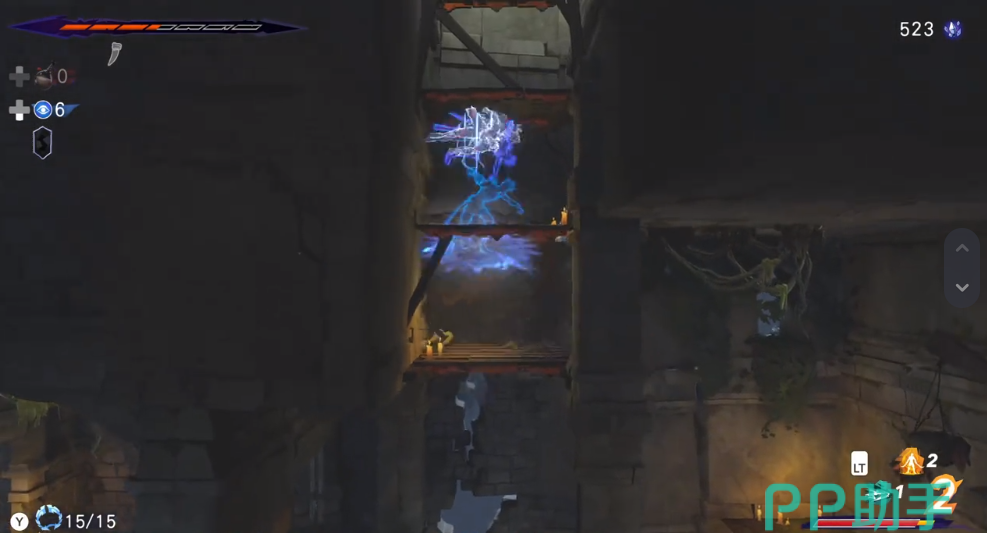 接着已经死亡的大流士国王突然复活并开始攻击我们,在这个战斗阶段敌人总共有三种形态。第一种形态是国王向前挥剑然后向地上放出冰追,这期间我们进行躲避的同时进行输出即可。当敌人损失掉三分之一血的时候,国王会阿胡拉马兹达借用神力圣火,这个时候他会向角色的方向进行几道射线,这个时候我们需要利用中间的钩索躲开射出的光线。