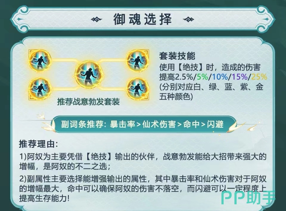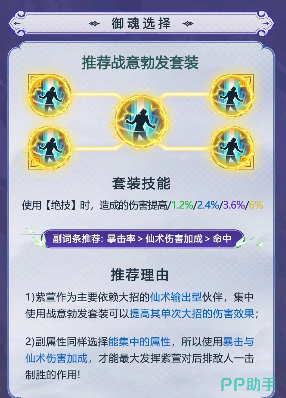 首先要知道游戏当中御魂的选择其实是多种多样的,这是因为游戏里面的定位角色的各种不同属性而特别设置的,让玩家们更好各方面的理解,其实可以根据角色的不同将它们大致分为输出型和辅助型的搭配角色,首先为大家讲解一下比较喜欢输出型角色适合搭配的御魂套装有哪些,在这里推荐玩家们选择战意勃发套装,战意勃发主要就是增加一个暴击的输出伤害,比较适合容易打出暴击的角色,例如阿奴和紫萱,装备上这样的话暴击率得到很大提高,输出能力的伤害也就会更高一些,同时暴击伤害也会得到更大的提高,它几乎适配于所有打暴击型输出的角色。