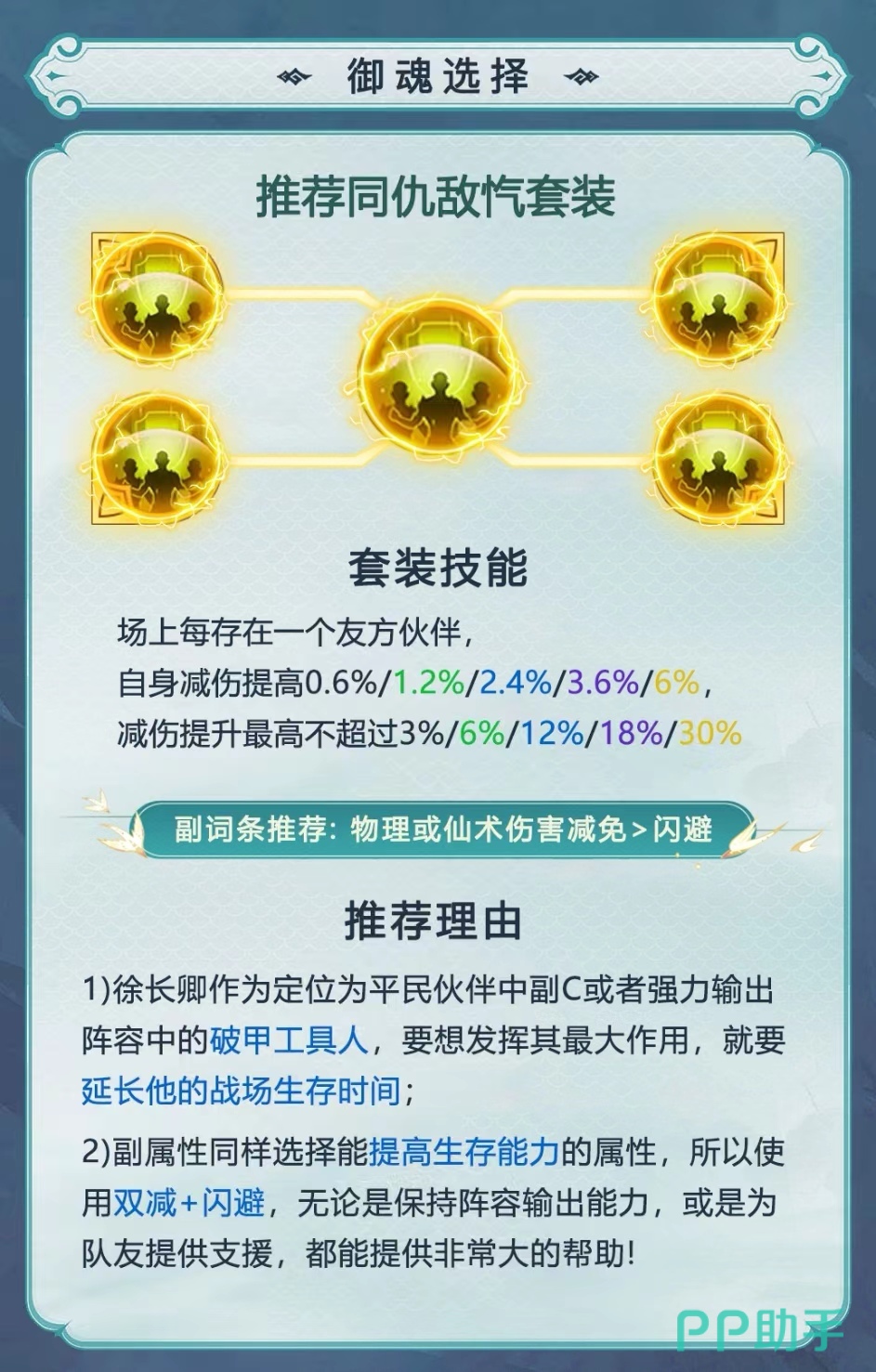 再来为大家推荐一下辅助型角色会更喜欢的御魂套装,这里为大家推荐的就是同仇敌忾套装,这个套装主要是增加角色的生存能力,这个东西可以帮助玩家们在游戏当中更好的生存下去同时也会让角色的续航能力得到大大提高,非常适合像徐长卿一样的副c角色,可以让其作为队伍中的破甲,不仅能为自己减伤,对于自己这方的伙伴还能迅速支援,也是一个不错值得选择的存在,主要就是在延长角色生存时间上非常靠谱。