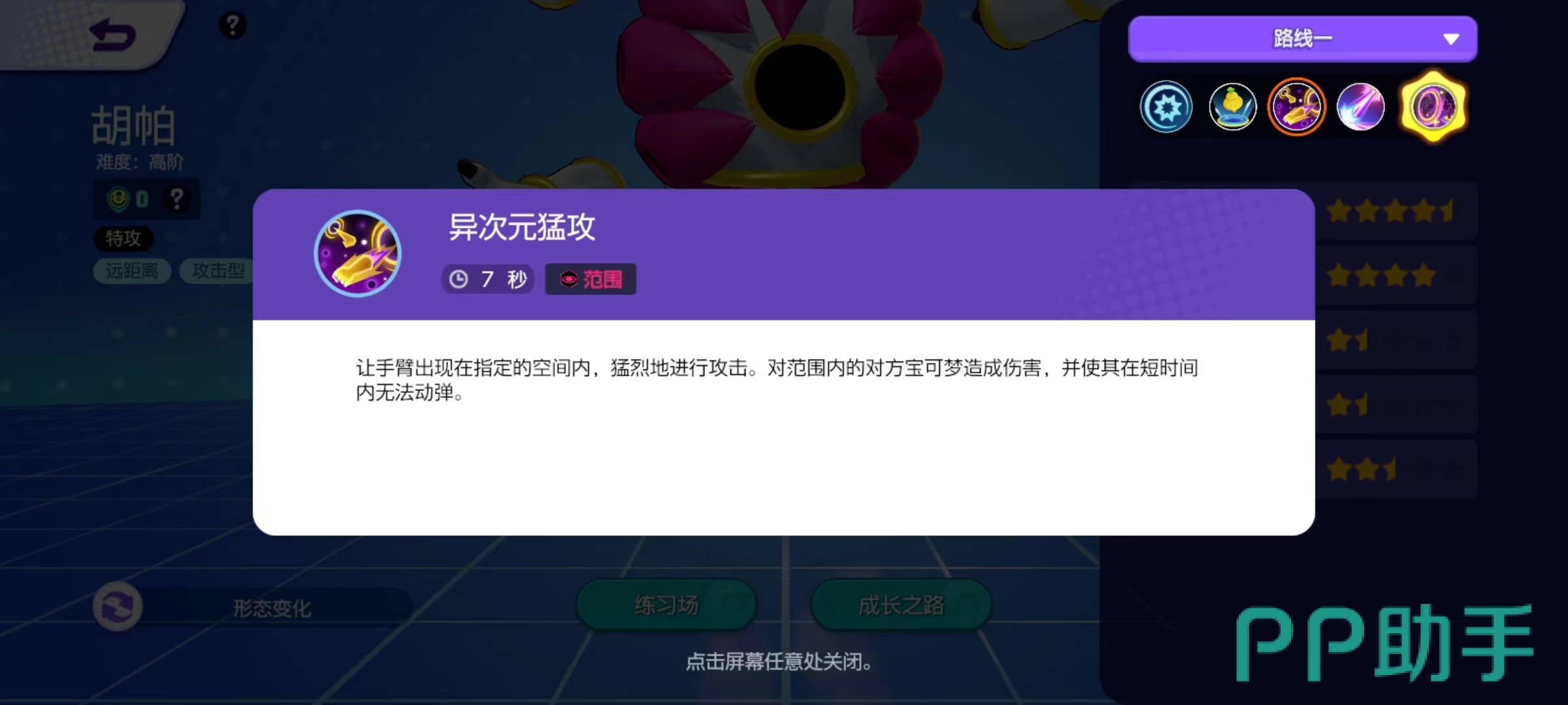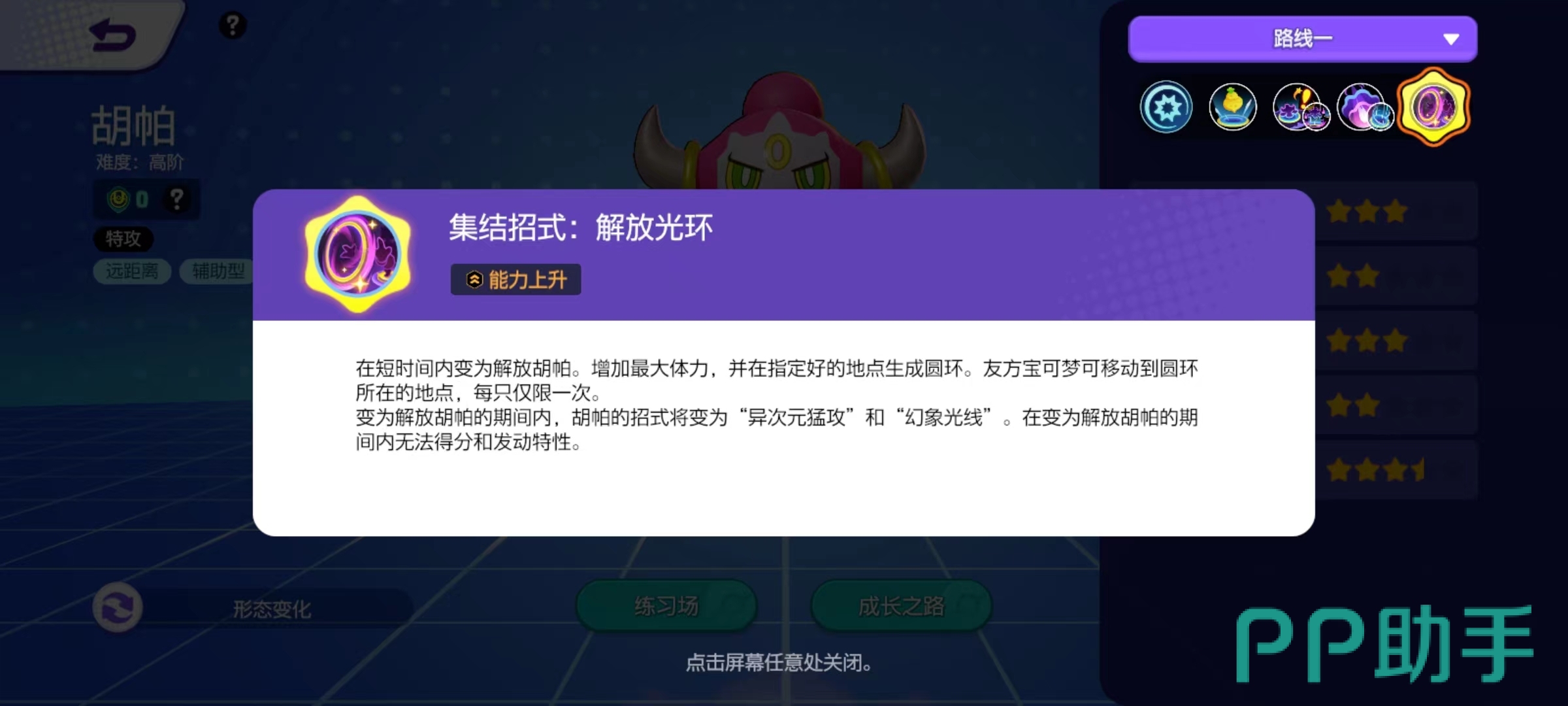 第1个技能异次元猛攻,手臂出现在指定空间内猛烈进行攻击,伤害范围内敌方宝可梦使其在短时间内无法移动,第2个技能幻象光线,发射横扫光线进行攻击,命中后造成伤害,在持续期间自身不会被控制。最后是大招解放光环,在短时间内可以变身成为解放胡帕,增加最大体力上限制,定位之后生成圆环,友方宝可梦可以移动到圆环所在地点,每次只能移动一次,在变身期间胡帕无法得分和发动特性。