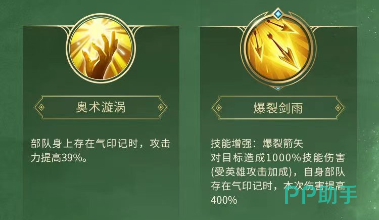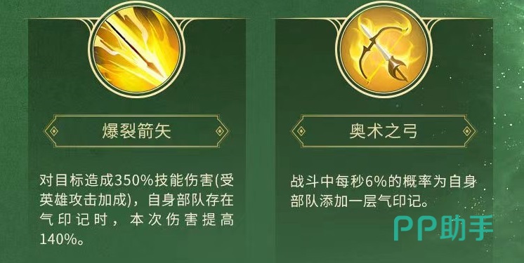第1个技能爆裂箭矢,对目标造成高额技能伤害,当自身部队存在气印记时,本次伤害还能再次提升。第2个奥术之弓,战斗过程中每秒就有6%几率为自己部队添加一层气印记,虽然几率不高,但是结合上较快的输出频率,还是能够做到频繁发动。第3个奥术漩涡,部队身上带有气印记时,攻击力获得大幅提升。最后一个爆裂箭雨,效果是对爆裂箭矢进行加强,对目标造成一次极高技能伤害,在自身部队存在气印记时,本次伤害再次提高。