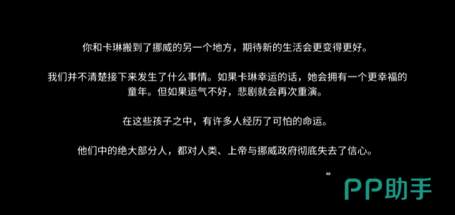 第一个结局是搬家,孩子在学校交到了朋友,但是也遇到了一些不开心的事情,由于孩子的身份较敏感这个设定,决定了他会在学校受到了不公正的对待,但是在种种不如意下,还是碰到了喜欢自己,能平等对待自己的老师,过了一段时间开心的日子,这时候玩家就需要耐心听她的情绪倾诉,因为好老师要离开的节点要到了,随着老师的离开,孩子情绪一天一不如一天,某一天他很晚回家,如果好感够高,他就会和玩家商量离开的事情,于是玩家决定带着孩子离开这个地方,在游戏的结尾,许诺和孩子去一个没有坏人的地方,孩子也对玩家放下心防,在树林边看了一眼来巡视的挪威国王之后,和孩子搬到另一个地方,期待着新的生活,这算是一个相对不错的结局。