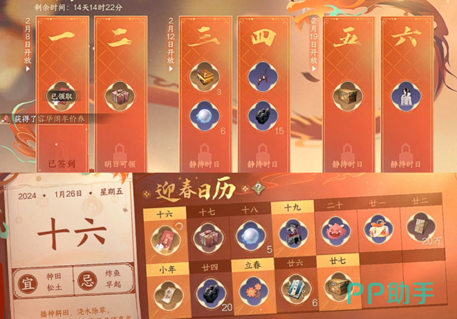 本次活动会开启大家最熟悉的春节庙会活动,也就是大家最熟悉的签到玩法,在迎春日历中,会有2张半价卷和高额代金券,在这个签到玩法中,还有三款免费的时装可以领取;有大家最期待的凤凰传奇联名皮肤【奢香赶月】,春禧暖岁和澄空冰轮/落蕊飞霜;